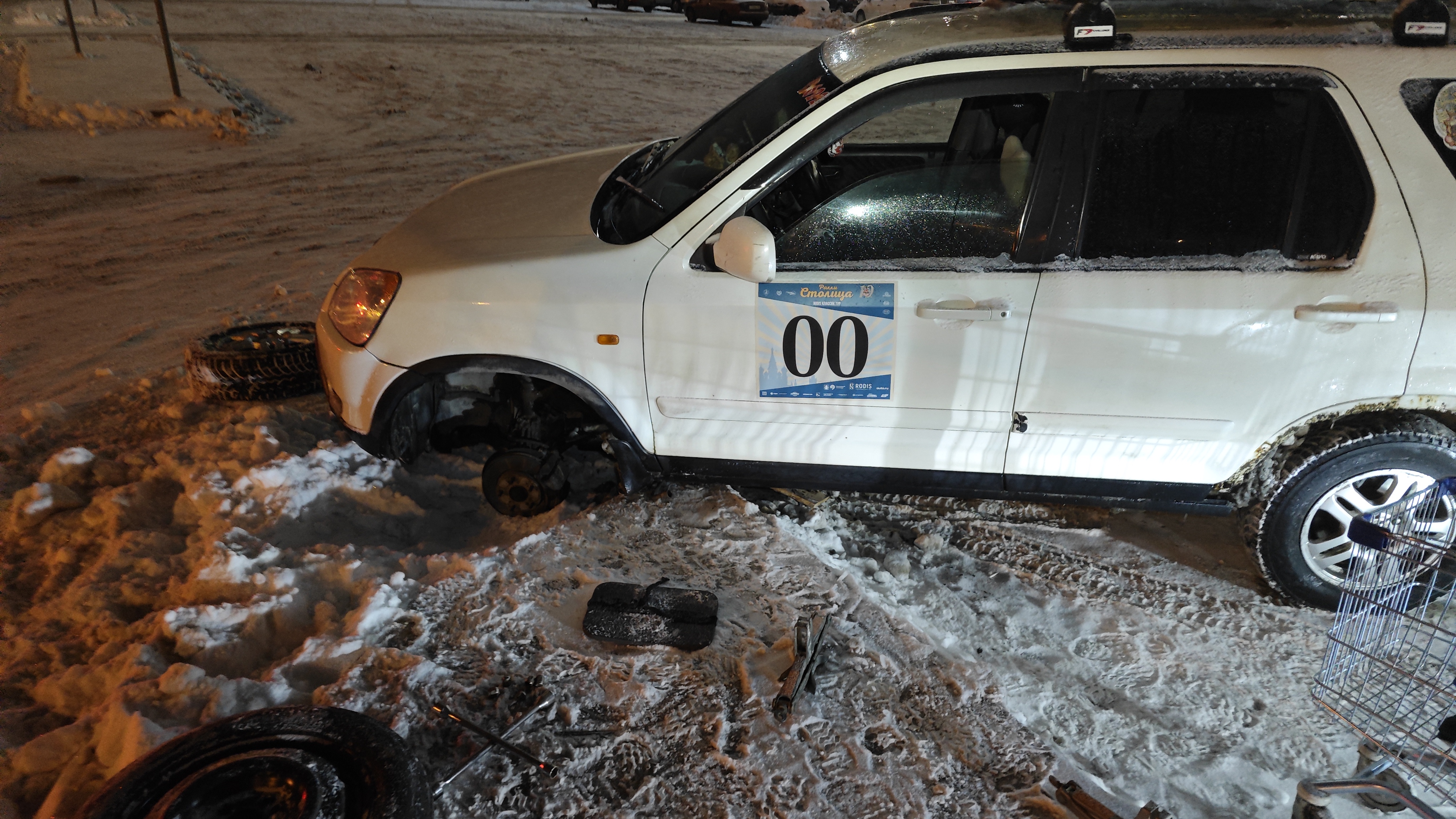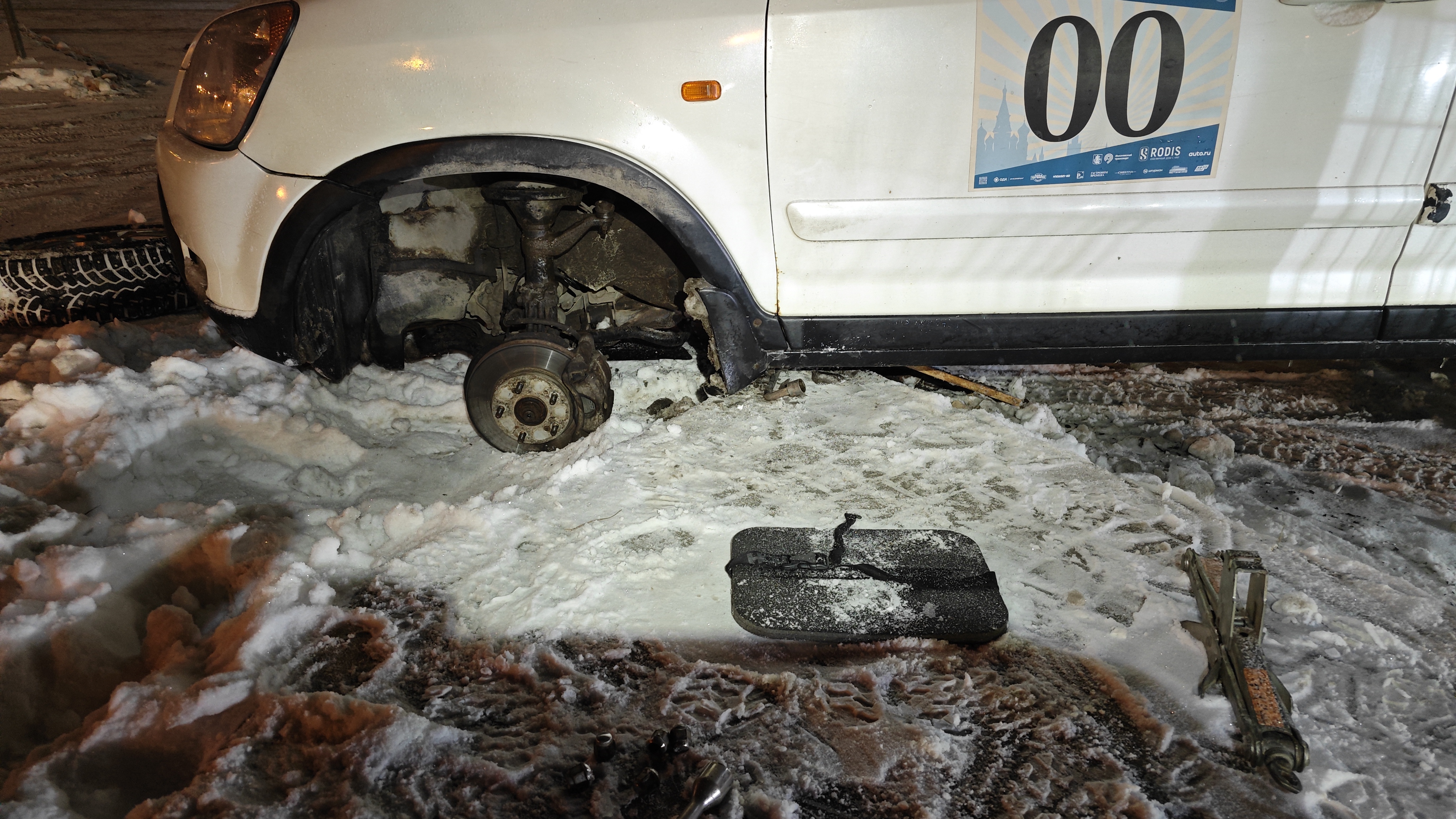 На ярике пробил колесо. Съехал к Ленте. Упала с домкрата, помогите поднять, чтобы докатку поставить. Пороги очень плохие.