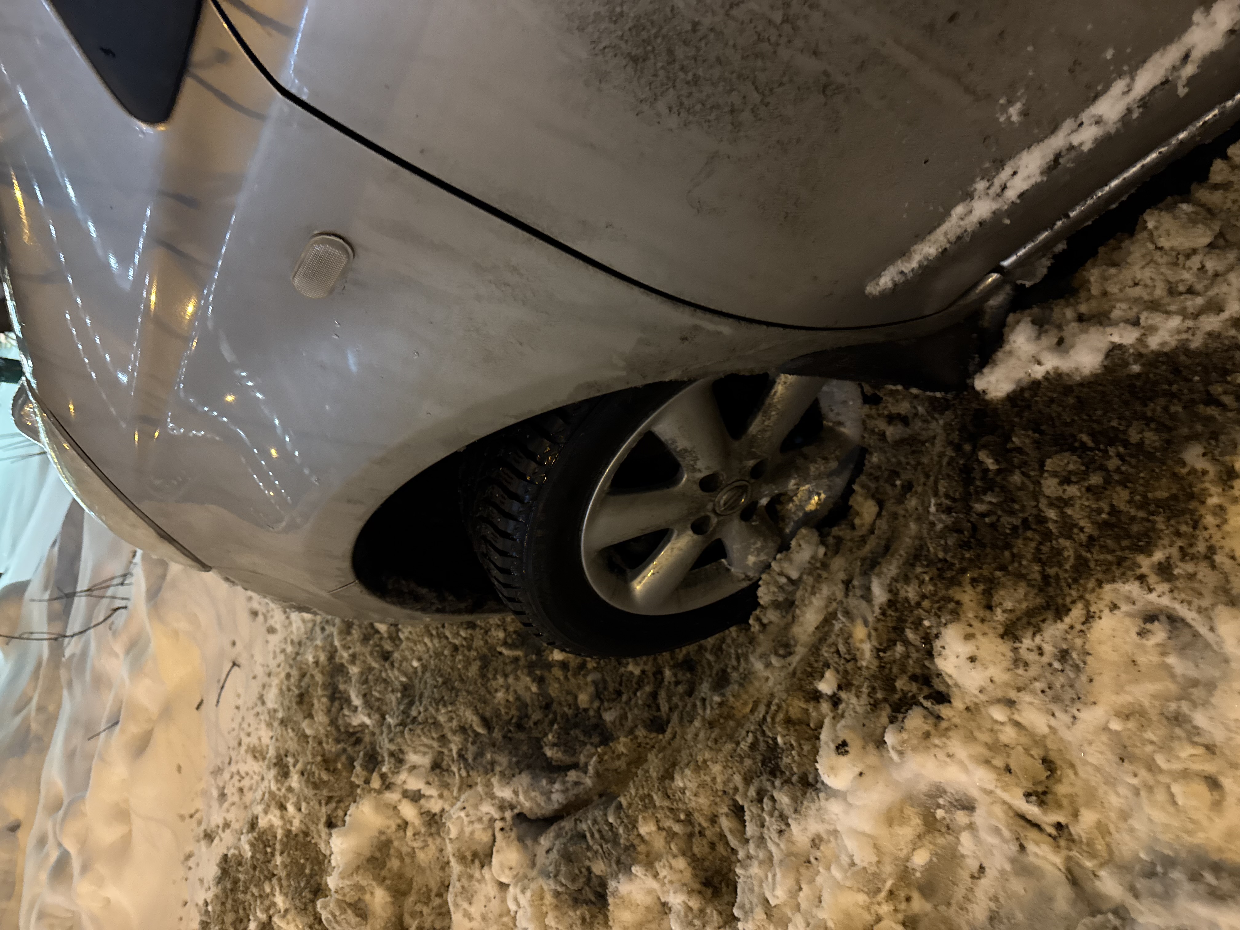 Застрял на парковке в снегу. Вылез за бордюр и еще больше застрял. Вот фото